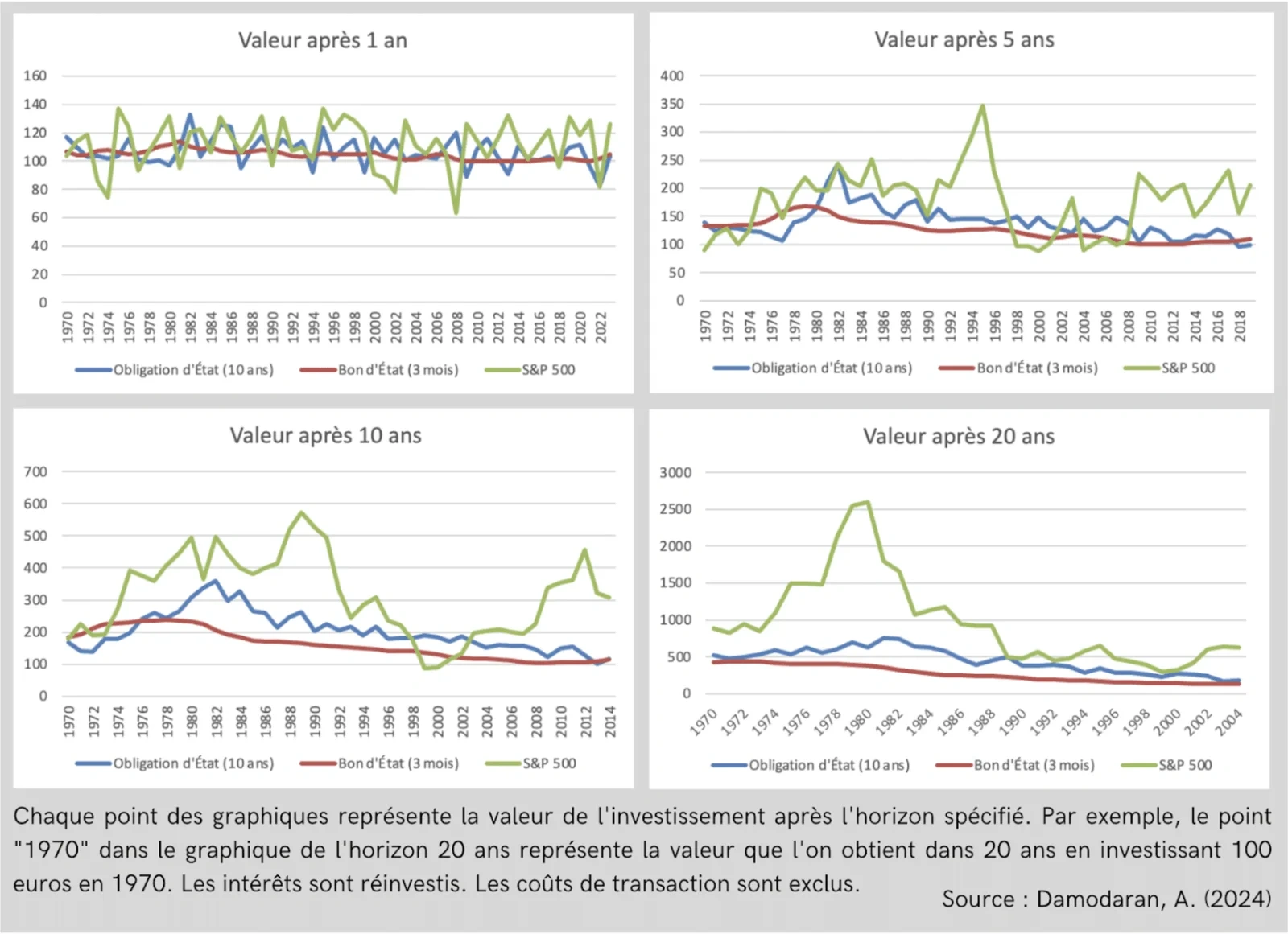 Figure 1 – Graphiques représentant la valeur de 100 euros investis à différents horizons dans 3 types d’actifs sur base historique entre 1970 à 2023