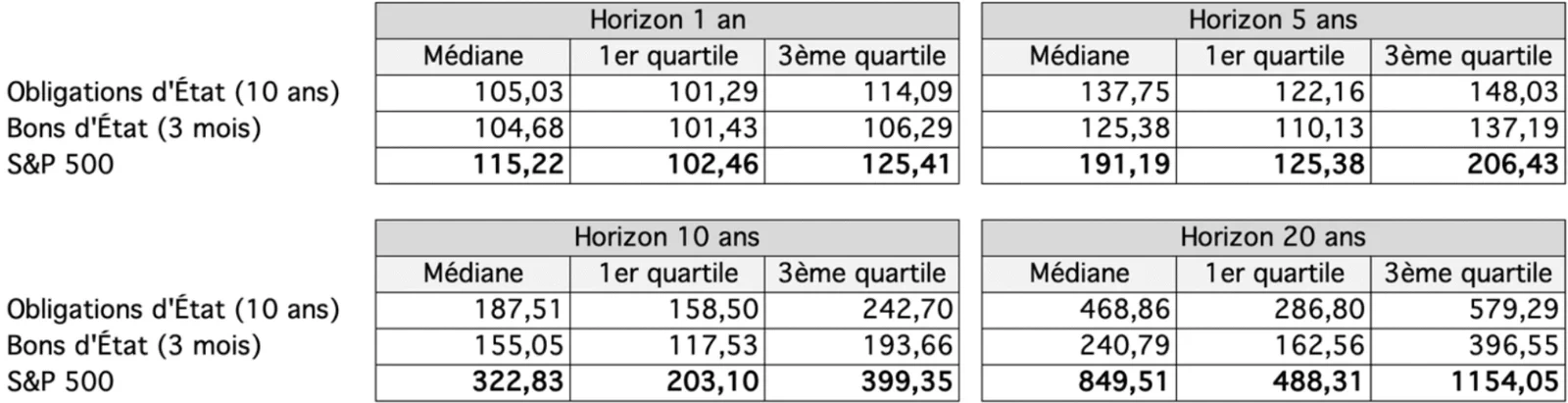 Pour illustrer ce point, prenons trois types d’actifs : les bons d’État, les obligations d’État à 10 ans et un portefeuille d’actions d’un fonds indiciel type S&P 500.