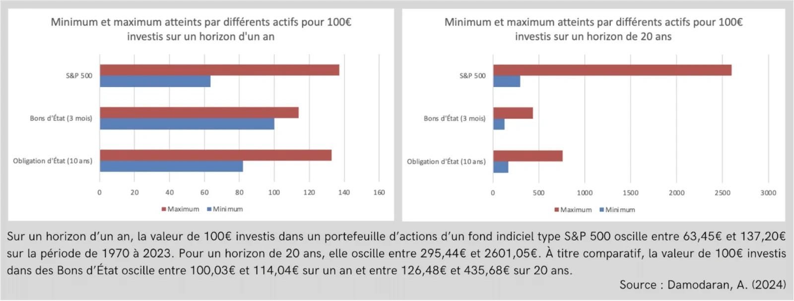 Figure 2 – Graphiques représentant les valeurs minimales et maximales de 100 euros investis à des horizons de 1 et 20 ans pour 3 types d’actifs différents sur base historique entre 1970 à 2023